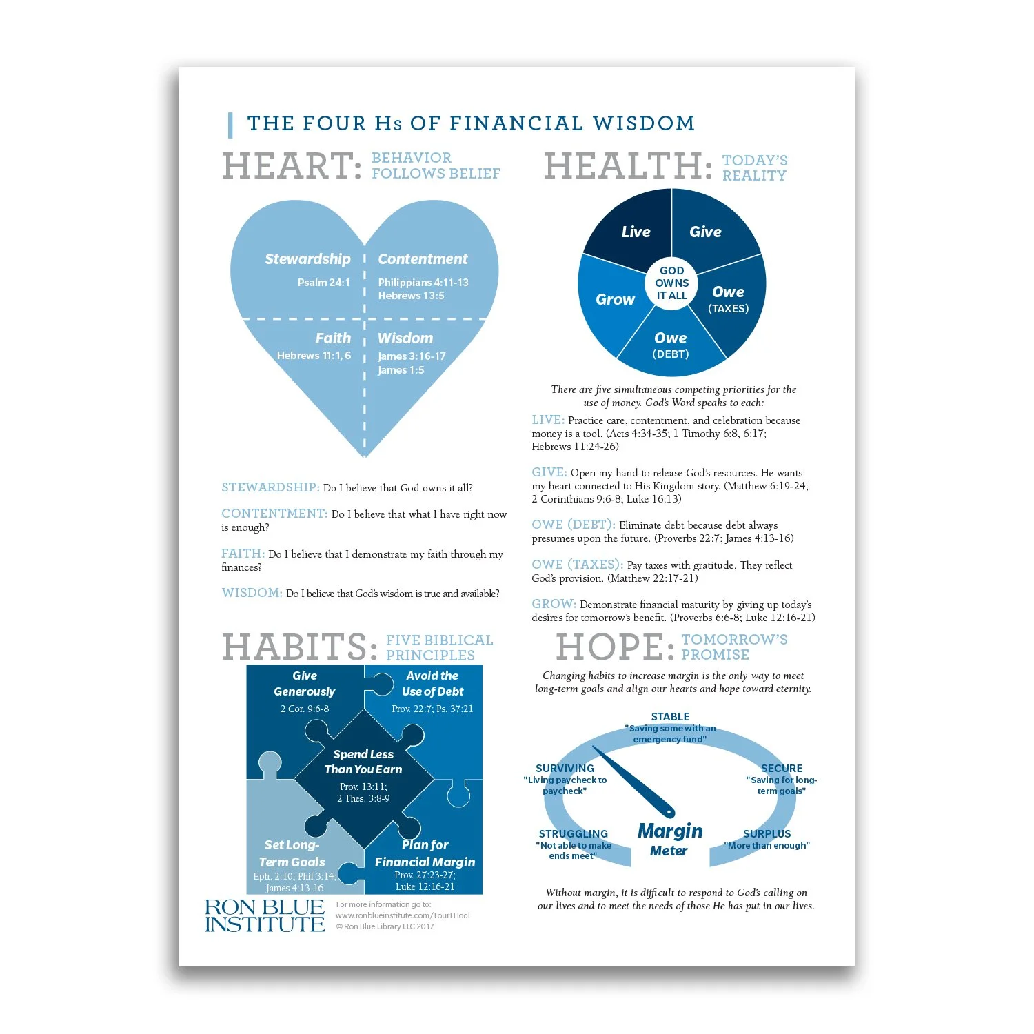 The Four H tool is a concise four-page handout introducing the framework of Heart, Health, Habits, and Hope for discussing biblical financial wisdom. It establishes a common language and foundation, addressing God’s teachings on the connection between our hearts and money, as well as our practices in its use.