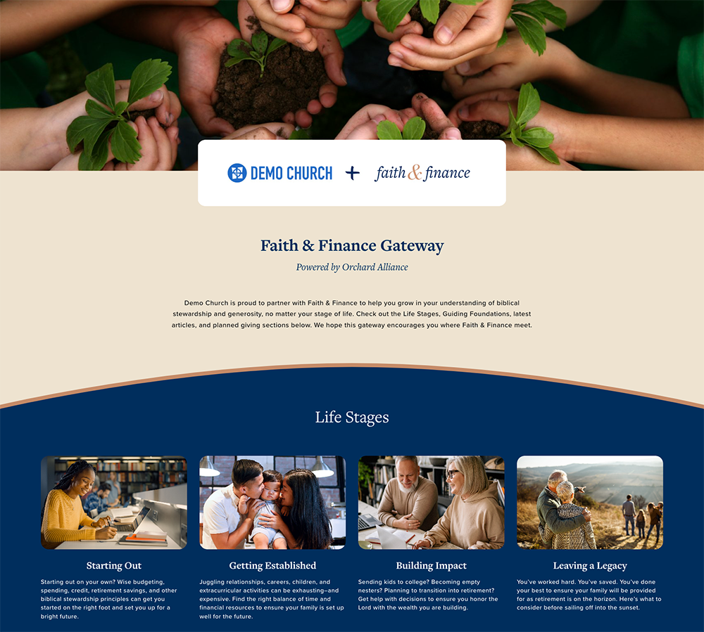 By adding customized planned giving web pages to your website, your church members can explore giving options beyond the offering plate - options that can benefit them and your church. Orchard Alliance will provide all the planned giving information; you provide your logo, colors, and preferred pictures to seamlessly integrate the pages into your current website. If your members have questions or are ready to establish a planned gift, Orchard Alliance’s experienced staff will walk them through the process. Check out an example of what these pages look like at Faith & Finance Gateway